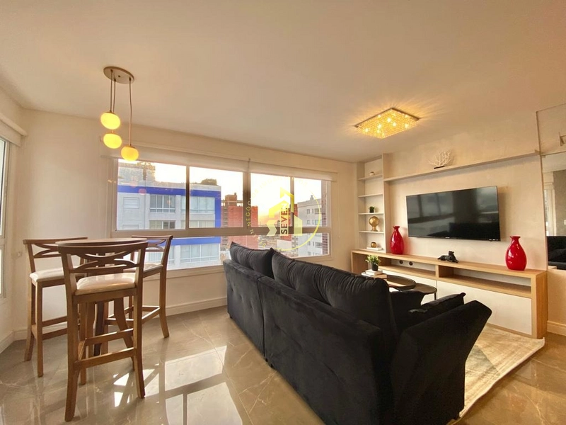 Apartamento com acabamento de alto padrão, nunca habitado, em edifício de luxo! Apartamento finamente mobiliado e decorado, pronto para ser habitado, de frente e com vista liberada para a serra, composto por 2 dormitórios sendo 1 suíte, ótimo living dois ambientes integrados com a cozinha estilo americana finamente equipada, área social de churrasco, área de serviço separada com espera para Junker, banho social, splits instalados, ótima vaga de garagem, rebaixo em gesso com iluminação em led, piso porcelanato. Edifício com hall de entrada finamente mobiliado e decorado, dois elevadores, gás central, hidrômetros individuais, portaria e portões eletrônicos, zeladoria permanente!